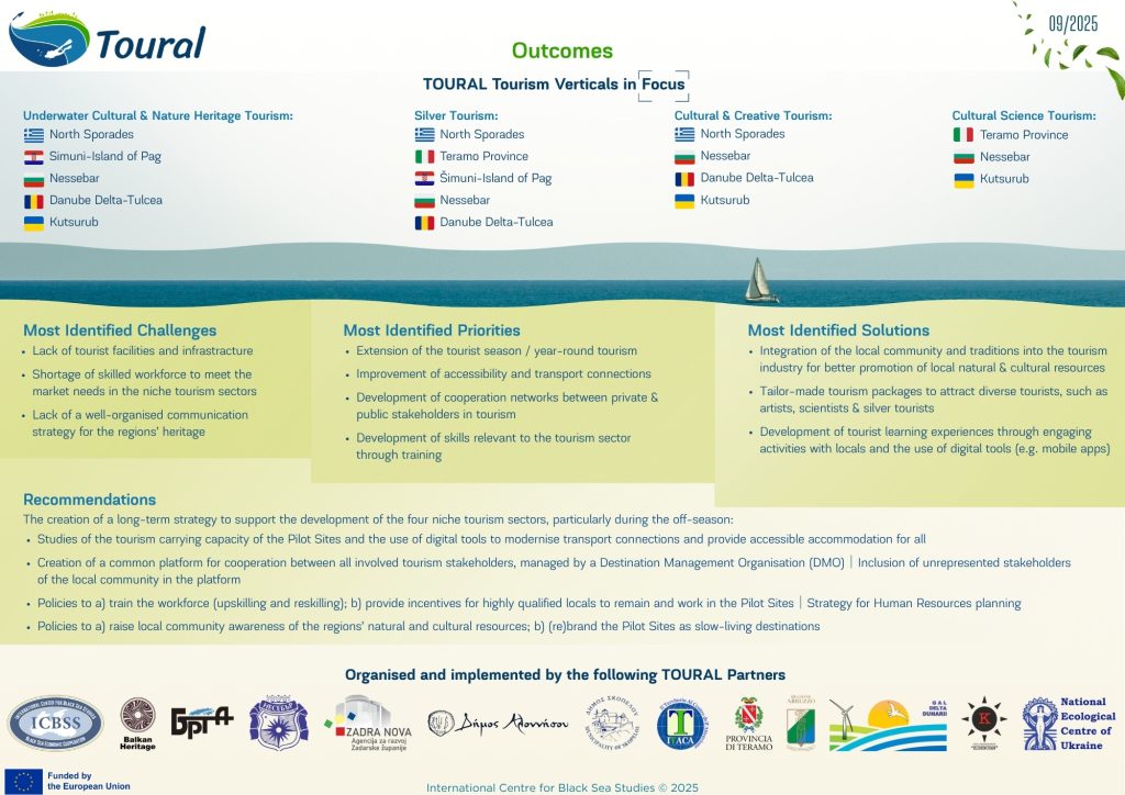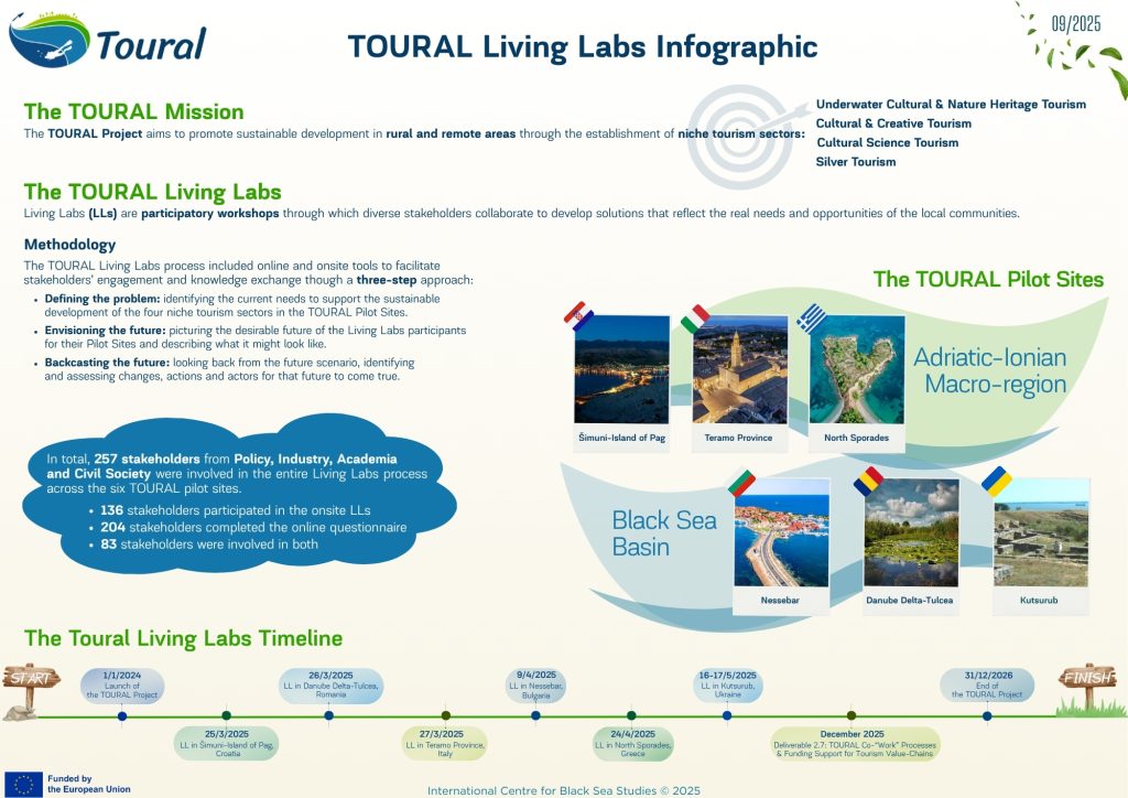 The TOURAL Living Labs were implemented across the six TOURAL Pilot Sites from the Adriatic-Ionian Macro-region (Italy, Croatia, Greece) and the Black Sea Basin (Bulgaria, Romania, Ukraine). Developed by ICBSS and implemented by local partners, this collaborative process incorporated online and onsite tools to encourage stakeholders’ engagement and facilitate knowledge exchange. Diverse stakeholders collaborated to develop solutions that reflect the real needs and opportunities of the local communities.