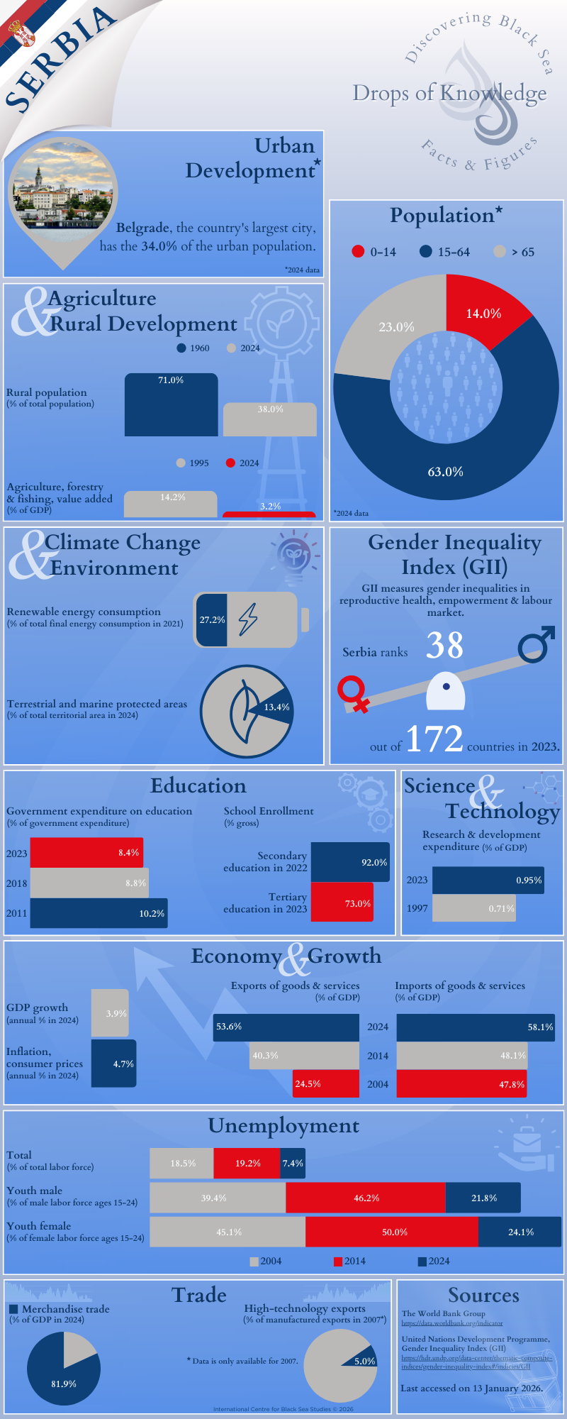 Thirteen infographics -one for each of the thirteen BSEC Member States- with the aim to provide comprehensive information of key socioeconomic indicators, such as population, unemployment, education, economy, and climate change. The infographics are published monthly.